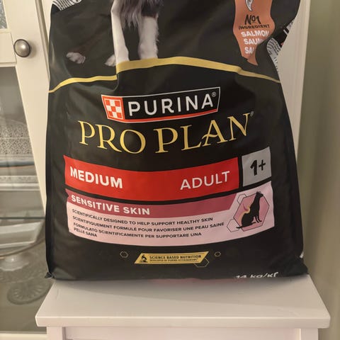 Purina Pro Plan Medium & Large Adult 7+ Sensitive skin. 14 kilo, oöppnad säck med utgångsdatum december 2026. Nypris 714 kr, säljes för 500 kr.