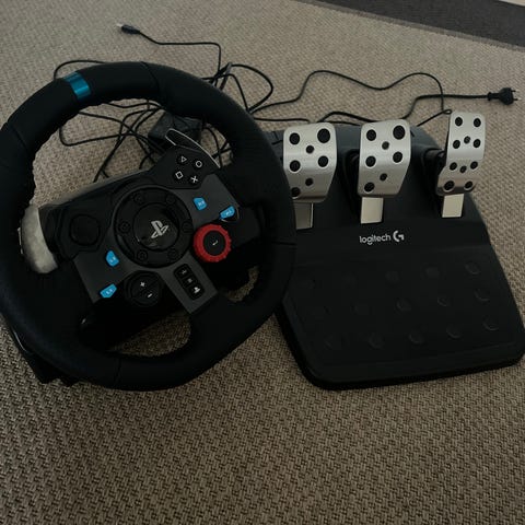 Logitech G920 Driving Force Racing Wheel spelratt och pedaler i svart färg. Utrustad med tre pedaler för gas, broms och koppling. Designad för racingspel med realistisk känsla och respons. Passar för användning med kompatibla spelkonsoler och datorer.