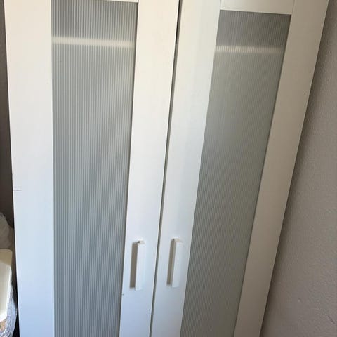IKEA Aage Petersen förvaringsskåp med vit och svart färg. Skåpet har flera fack och dörrar, inklusive en glasruta med fyrdelad design. Tillverkat av trä och andra material. Passar för förvaring av olika föremål i hemmet.