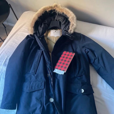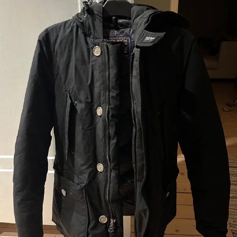 Woolrich vinterjacka i blå färg, storlek XS för herr. Jackan har en huva med avtagbar pälsdetalj och flera fickor framtill. Den är tillverkad för att ge värme och skydd under kalla vintermånader.