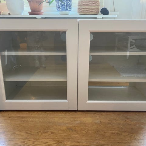 IKEA bestå skåp i trä med två glasdörrar och hyllor inuti. Skåpet har en ljus träfinish.