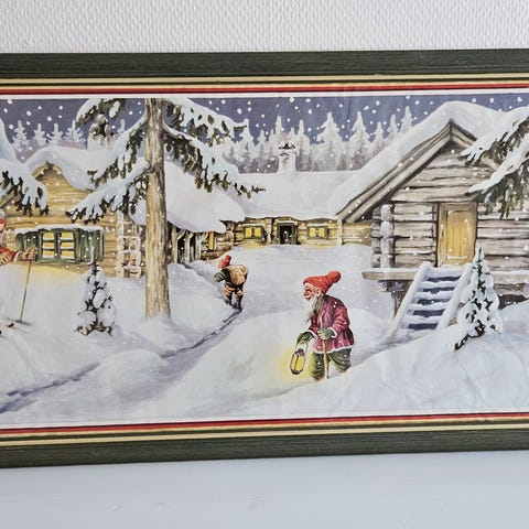 Stor och nostalgisk julbonad av A. Thorén, daterad 1972, med klassiskt motiv av tomtar som lastar julklappar i ett vintrigt bylandskap. Tryck på papper, professionellt inramad hos Lindbergs Ram i Luleå i passande tidstypisk ram.