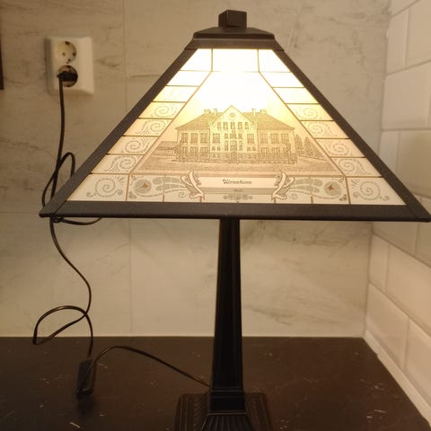 Elegant bordslampa i antik-inspirerad guld/brons-design med lyxig sammetsliknande lampskärm. Stabil fot, bra kvalitet och fint skick. Perfekt som stämningsbelysning eller som snygg inredningsdetalj
