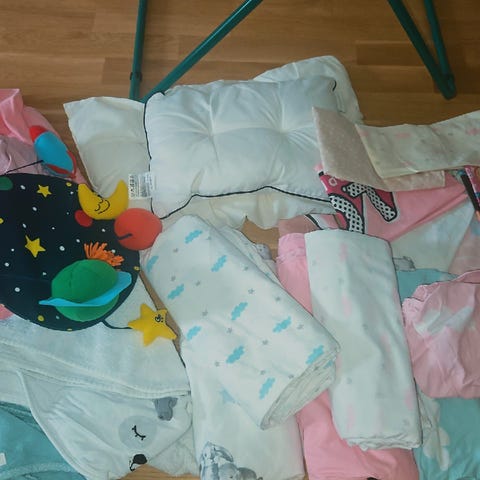 Spjälsängsskydd från Färg & Form, grå med vita moln. Cirka mått L 360 x H 28 cm.