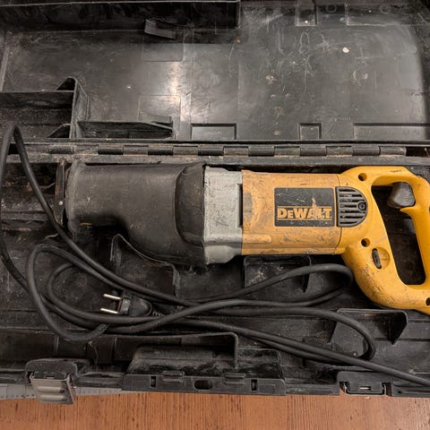 Stabil radialsåg / radialarmsåg från DeWalt Power Shop. Skruvstäd och plåtskåp undertill med förvaring.
