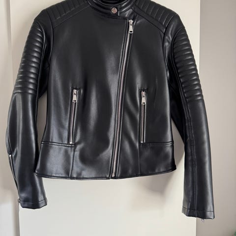 Zara Övriga jackor i svart färg, storlek S för dam. Jackan är tillverkad i konstläder och har dragkedjor på framsidan samt ett bälte i midjan. Passar för vardagligt bruk och kan användas som ytterplagg vid mildare väder.
