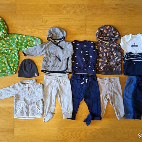 Klädpaket i storlek 86 säljes. Det mesta väl använt men helt och rent, vissa plagg är så gott som nya. Några plagg är sedan tidigare namnade. Plaggen är tvättade i allergitestat parfymfritt tvättmedel. Djur- och rökfritt hem.