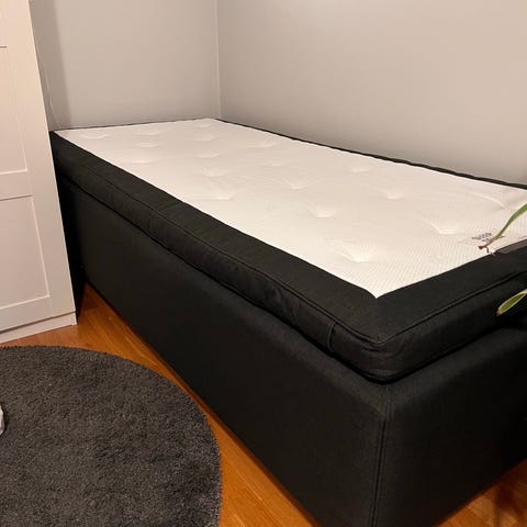 Säng med måtten 140x200 cm, höjd madrasser, förutom bäddmadrass, 42 cm i beigevit tygklädsel. Jätteskön säng, säljes på grund av platsbrist.
