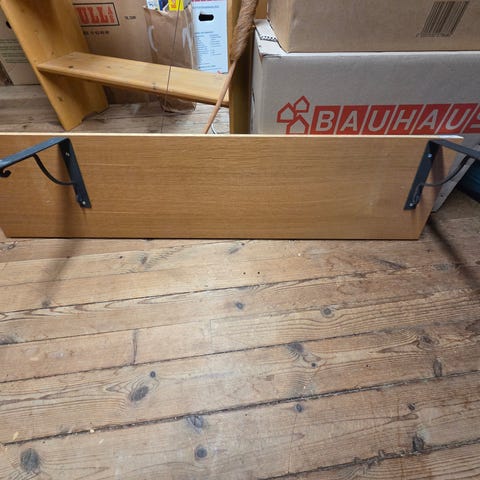 • 2 vägghyllor med metallkonsoler (mått: 58 × 25 × 52 cm)