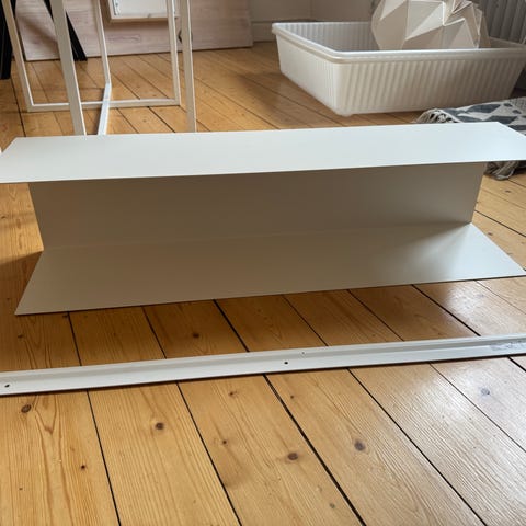 • 1 större hyllplan/bordsskiva (mått: 80 × 40 cm) – en kortsida är ej målad från tidigare ägare (syns på bild)