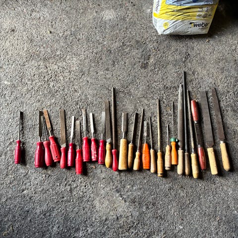Sats med olika verktyg inklusive bågsågar, handsågar, elverktyg och slipmaskin. Arbetsbänkar och hyllor i källare eller verkstadsmiljö. Verktygen är av varierande storlek och typ, lämpliga för snickeri och allmänt hantverk. Materialen är huvudsakligen metall och trä.