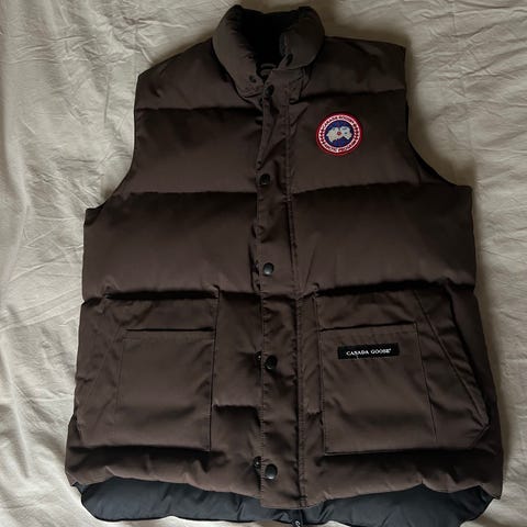 Canada Goose Västar i storlek XL för herrar, grå färg. Västen är vadderad och har ett märke med logotyp på bröstet. Innersidan har en etikett med varumärkets namn och detaljer. Materialet är anpassat för utomhusbruk och ger värme och skydd.