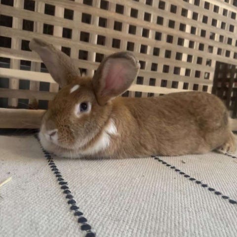 Snäll liten brun/vit fläckig hane.Korthårig. Mamma dvärgvädur/minilop pappa rex/angora.