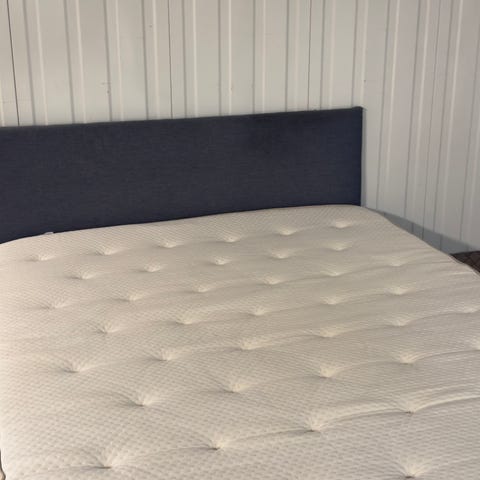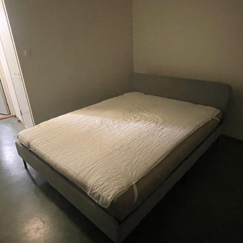 Sängram i storleken 140x190 cm tillverkad av konstruerat trä med betonggrå finish. Sängramen har en huvudgavel med stoppade kuddar i grått tyg. Den kan enkelt demonteras och tas i delar. Passar madrasser i angiven storlek. Madrass ingår. Inga defekter alls. Hämtas i Solna