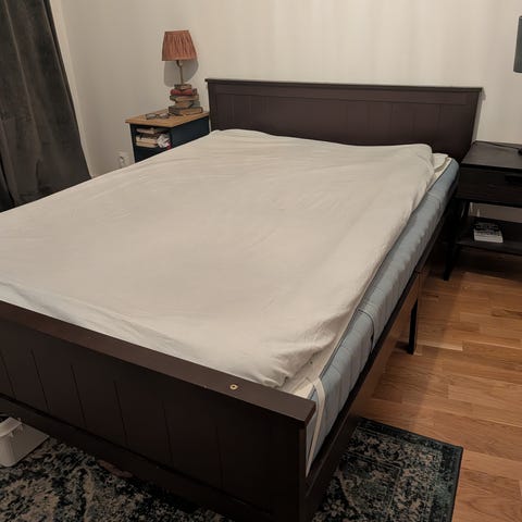 Bed in size 140x190 cm made of wood with stome grey finish. It come with the headboard with backrest attached. It can be easily disassembled and taken in parts. Mattress included of the same size and has no defects whatsoever. It is new condition. Can be picked up from Solna.