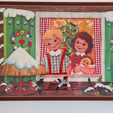 julbild jultryck retro tomtar vintermotiv fototryck 50-tal gammaldags jul nostalgisk jul julpynt vintage stuga snö landskap ramad bild samlarobjekt juldekoration