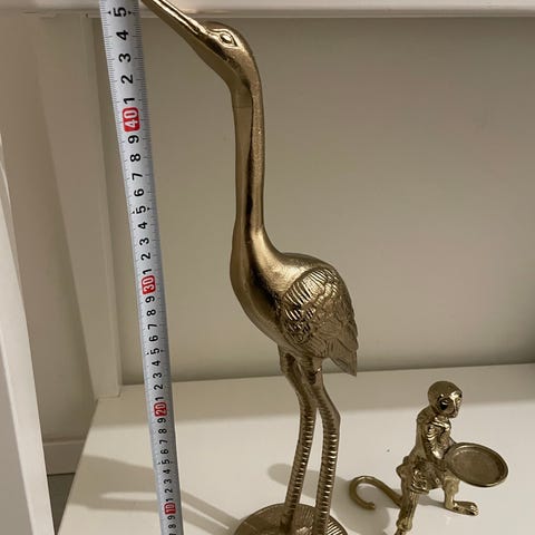 Två dekorativa ägg i mässing placerade på svarta fyrkantiga baser. Äggen är av olika storlekar, en större och en mindre. Materialen är mässing för äggen och svart för baserna. Produkterna kan användas som inredningsdetaljer.