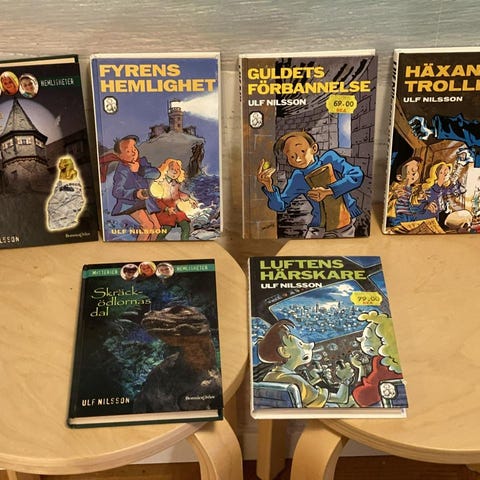 Jag säljer fyra stycken böcker med och av Fredrik Skavlan. Helt nya! ”Fredrik Skavlans samlade teckningar” med skyddande pappärm, bokserien ”Mystiska Milla” som han gjort tillsammans med Unni Lindell; Vintercirkusen, Sjustjärnan och Spökskolan.