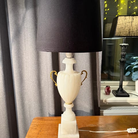 Nyckelord: exklusiv marmorlampa, italiensk alabasterlampa, vintage urnform, handskuren dekor, Made in Italy 1957, original samlarobjekt, retro belysning, klassisk design, lyxig nattduksbordslampa, dekorativ fönsterlampa, tidlös inredningsdetalj, elegant hembelysning, unikt samlarföremål, varm mjuk ljus, perfekt julklapp