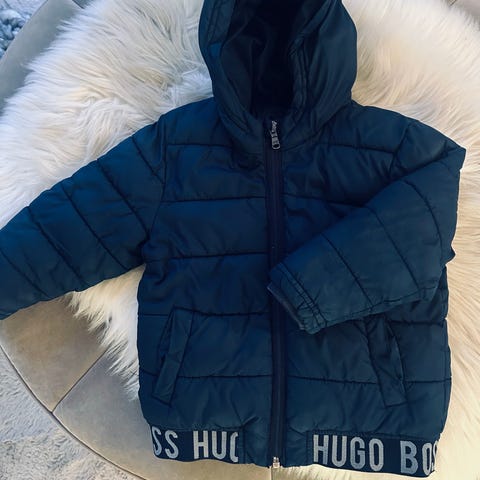 Storlek 9 månader / 71cm. Fint set från Hugo Boss med en t-shirt, ett par byxor och en zip hoodie. Setet är i marinblått med vita detaljer och Hugo Boss loggan tryckt på alla tre delarna. T-shirt med knappar för att lättare trä över huvudet. En ytterst liten antydan till att det är tvättpåverkat.