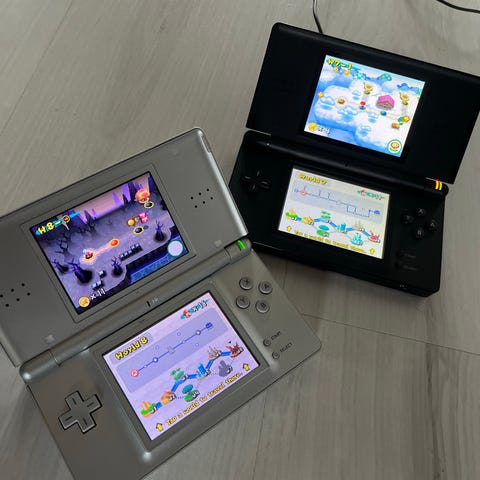 Nintendo DS rosa handhållen spelkonsol med två skärmar.