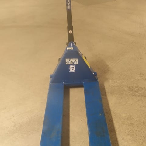 Okänd modell palllyftare i orange färg tillverkad i stål. Utrustad med ett handtag för manuell styrning och är avsedd för transport och lyft av pallar i lager eller industriella miljöer.
