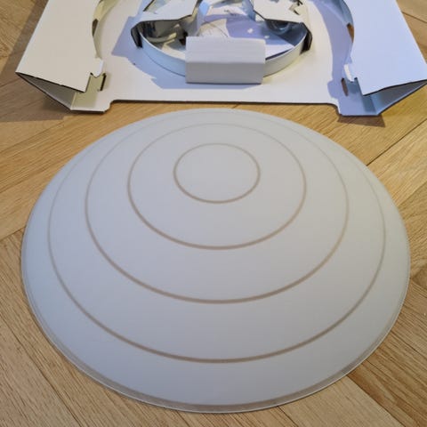 Det är bara själva glasskärmen i original som saknas och kan ersättas med en annan vid behov. Bifogar en bild på en sådan lampskärm som saknas. Lampan kan användas även utan skärm vid t.ex. renovering.