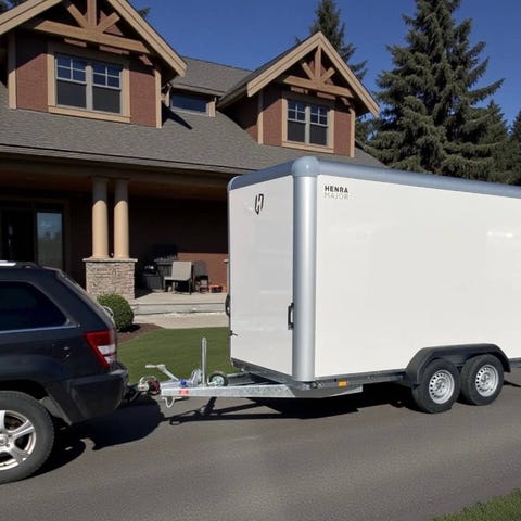 Ett Svensktillverkat, bromsat, varmgalvat, skåpsläp från CO släpet med dörrar bak och bra lastvikt. Väggarna är av träplyfa och taket är av glasfiber.