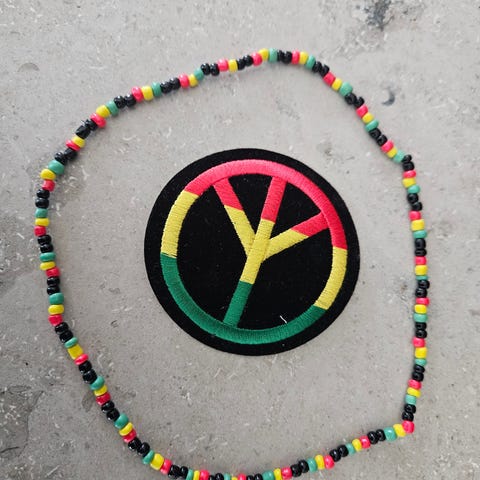 Ett halsband med peacemärke. Använd en gång. Går att välja längd på halsbandet. Fin och bra kvalitet.
