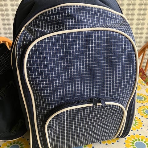 helt ny aldrig använd svart picknickryggsäck, fullt utrustad med det som behövs - sittunderlag, öppnare, termos, koppar, teleskop-grillpinnar, burkar med lock. kylväska. vikt 1,3 kg.