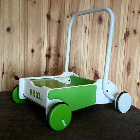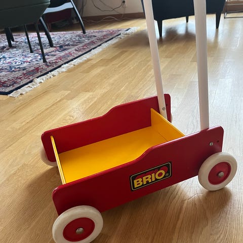 BRIO Barnvagn Lekvagn tillverkad i trä med röd och gul färg. Designad för barn och avsedd som leksak för att främja motorik och lek.