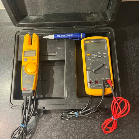 Fluke T5-600 och Fluke 179 Multimeter Elektronikinstrument med kablar och sonder. Används för elektriska mätningar såsom spänning, ström och resistans. Bärbara och handhållna enheter med digital display.