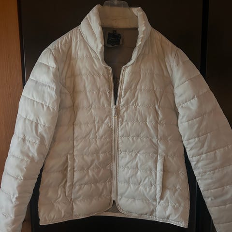 En snygg jacka i beige färg med en krage som kan fällas upp. Jackan har två fickor framtill och en knappstängning. Den har även en bälte i midjan.