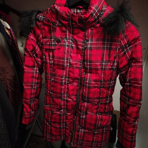Snygg leopardmönstrad jacka med huva och pälskant. Jackan har en dragkedja framtill och två fickor på sidorna. Den har en åtstramning i midjan för att skapa en mer figursydd siluett.