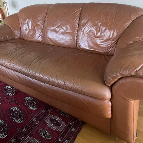 Två plommonfärgade skinnsoffor tillverkade av italienska Natuzzi av märke Firenze. Välanvända, men hela och jättesköna att sitta och ligga i! Båda är ca 85 cm djupa och 84 cm höga. Tvåsits-soffan är ca 155 cm bred och tresits-soffan är ca 202 cm bred. Inköpta för 20 000 kr.