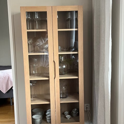 Minimalistiskt vitrinskåp i skandinavisk stil med yta i vitpigmenterad ekfanér och ben i svartlackerat stål. Dörrarna har härdat glas och infällda handtag, vilket ger ett stilrent uttryck. Hyllorna inuti skåpet är gjorda av samma ljusa trämaterial och kan justeras till önskad höjd.