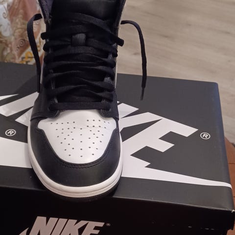 Nike Air Jordan 1 Sneakers i storlek 46. Skorna har en färgkombination av svart, vitt och grått. Materialet är av hög kvalitet med detaljer i läder. Designen är klassisk med svart Nike-swoosh och Air Jordan-logotyp på sidan. Skorna är lämpliga för vardagligt bruk och sportaktiviteter.