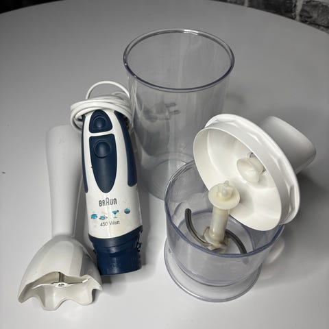 Manuell grönsaksskärare med tre olika skärblad för rivning och skivning. Inkluderar en vit basenhet med behållare, ett blått fäste, samt handtag och olika tillbehör för matberedning. Tillverkad av plast och metallkomponenter, användbar för kök och matlagning.