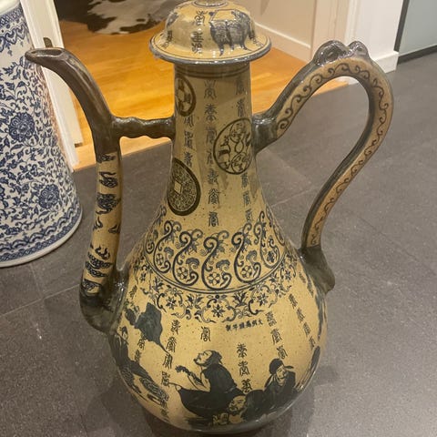 Detta är en liten, handmålad museireplika av en antik grekisk knäböjd lekythosvas, med en avbildning av en figur i svartfigursstil. pris 380