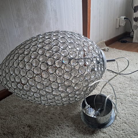 Rubrik Inte Kristallampa men cool taklampa Beskrivning Diameter ca 25cm hänger nog ner 30 cm från tak men går att ta bort spegelringar o anpassa ned häng. E27 sockel så det går att skruva i led med det. Har även gamla hederliga fast nya glödlampor att sälja e27 60w 40w