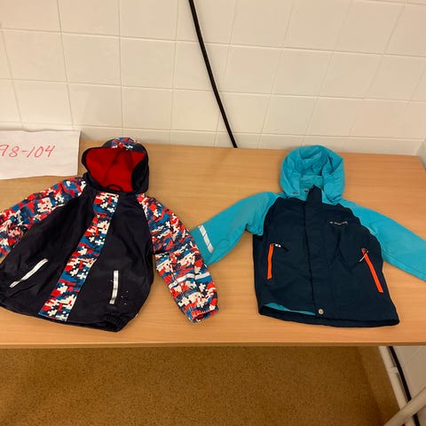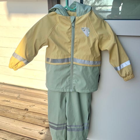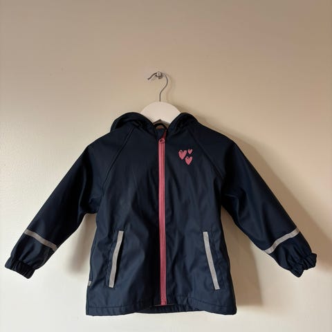 Mörkblå regnjacka med huva. Jackan har dragkedja framtill och två fickor. Reflexdetaljer finns på ärmarna och nedre delen av jackan.