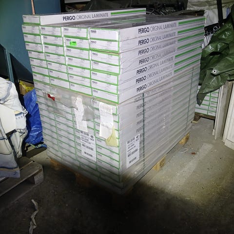 Laminatgolv som byttes i samband med renovering. Mörkbrun i tonen. Ligger på vinden och har samlat en del damm men annars i gott skick. Uppskattningsvis 15-16 kvadratmeter.