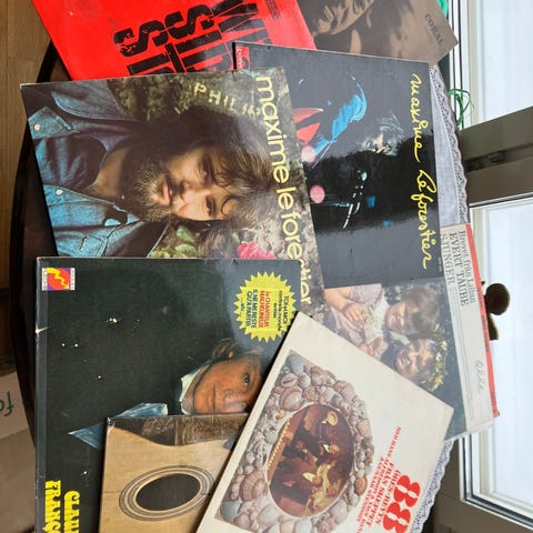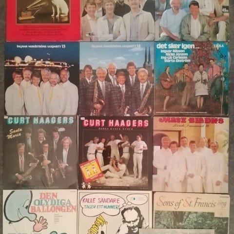 En samling av vinylskivor med olika artister och musikgenrer. Skivorna varierar i omslagsdesign och inkluderar både manliga och kvinnliga artister. Materialet består av vinyl med pappersomslag. Passar för samlare och musikentusiaster.