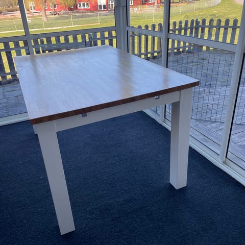 Matbord i rektangulär form med lätt rundade hörn. Passar som matbord i kök eller vardagsrum och ger plats för flera sittplatser runt bordet. 60-talsdesign.