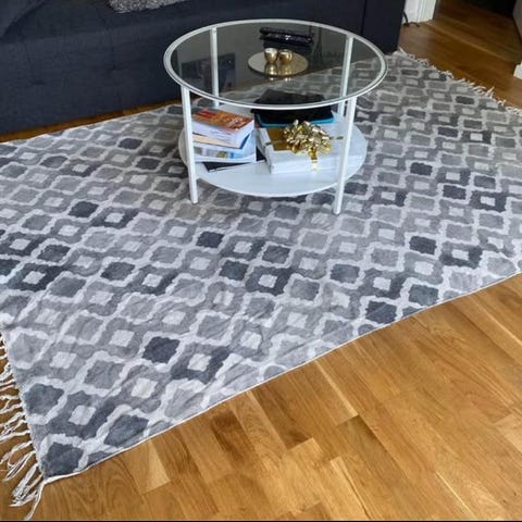 Madrid Frame har en grå bottenfärg med matchande langettering. Mattan har en vit board och baksidan är gummerad, vilket gör att mattan ligger stadigt på plats. Eftersom Madrid inte har någon tät lugg där smuts kan fastna, så är den tacksam att rengöra och dammsuga.