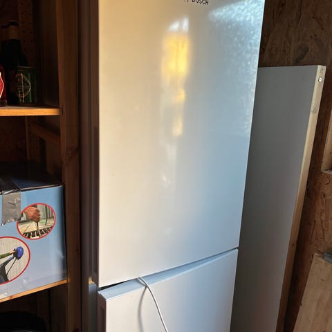 Säljer våran Bosch kombiskåp i rostfritt stål med flera hyllplan och förvaringsutrymmen. Kylskåpet har en rymlig interiör med glas- och plasthyllor samt lådor för frukt och grönsaker. Yttermaterial i rostfritt stål med några mindre bucklor på ytan.