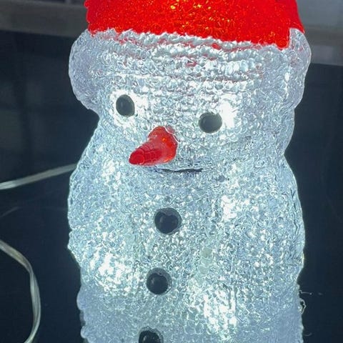 Superkool snögubbe i akryl för inom- och utomhusbruk. Höjd 33 cm och bredd 35 cm. Sladdlängd med transformator 5 meter. Kan hämtas på Fridhemsgatan vid Fridhemsplan.