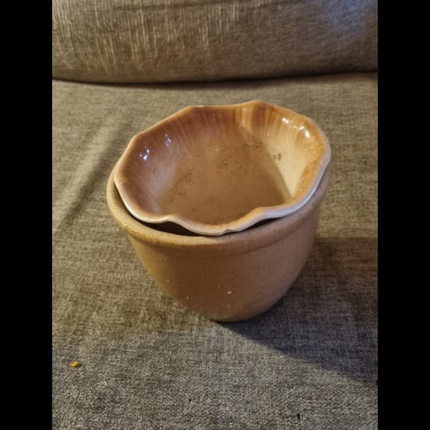 Utmärkt skick! 17 cm hög, 17 cm vid o 13 cm djup. Beige/ Senapsgul.