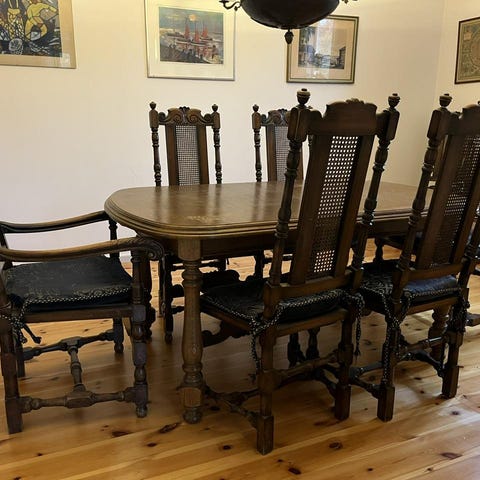 Stort bord 2 meter långt ink 2 skivor / 2 karmstolar 6 stolar / välvårdat inga rangliga stolar vitt