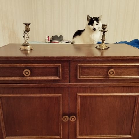Äldre svart skåp med patina och fungerande låda.